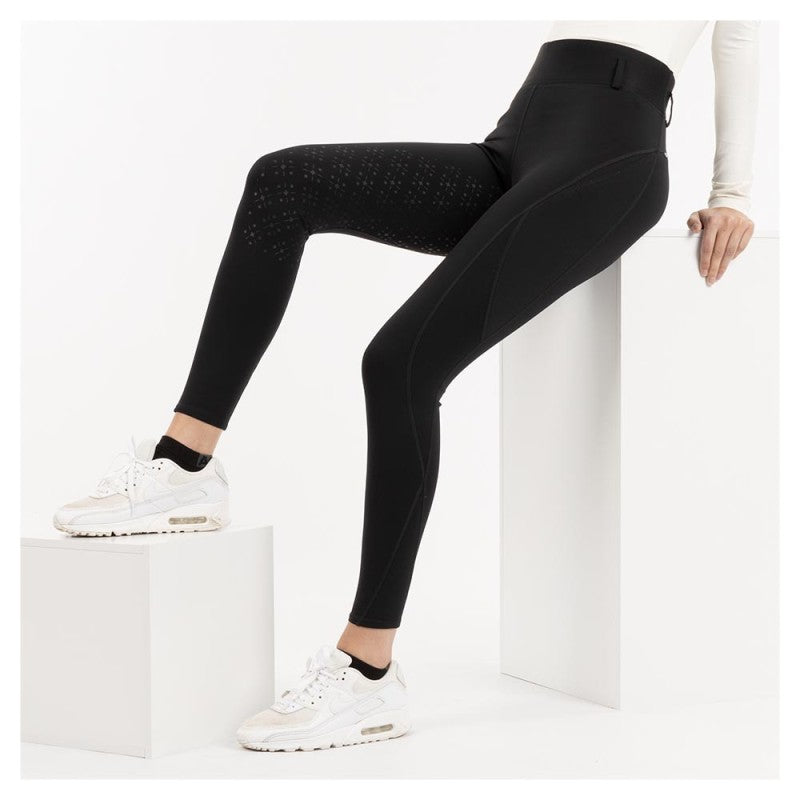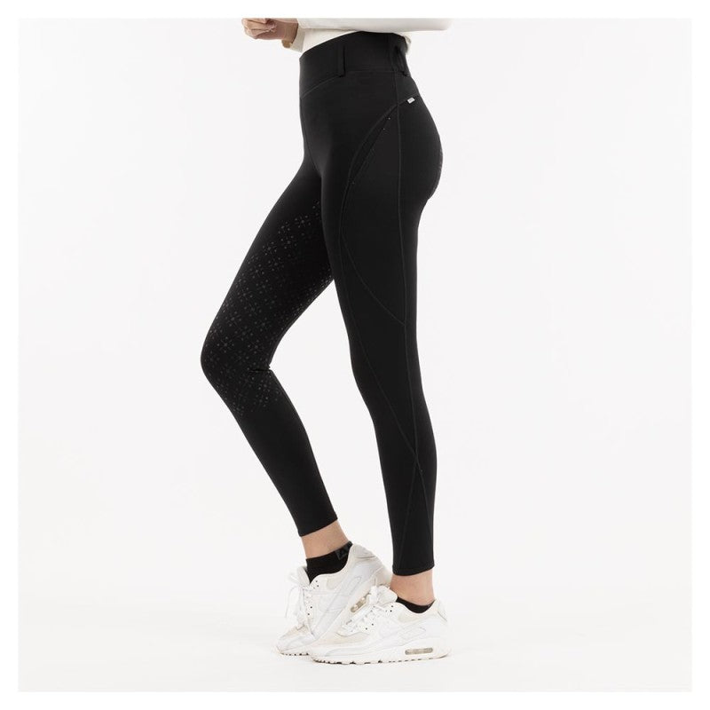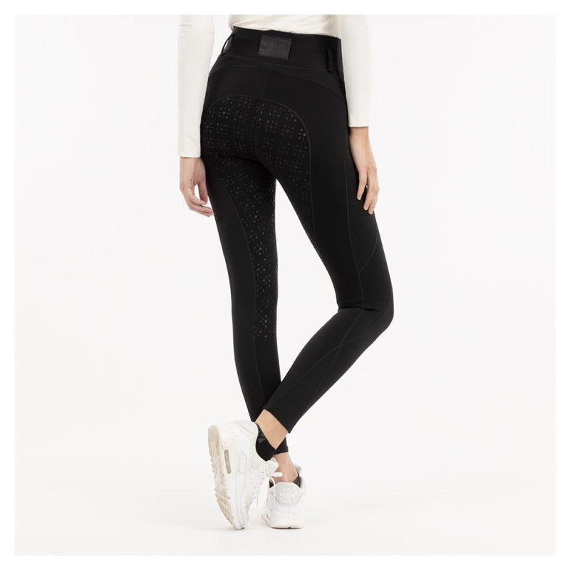 Fine riding tights from the ANKY winter collection. This riding tight is made of stretch fabric with excellent moisture wicking and breathable properties. The riding tight has a matte transparent full silicone seat for extra grip. These treggings feature a high waistband with elastic and belt loops. The side pockets for a cell phone are finished with black rhinestones.