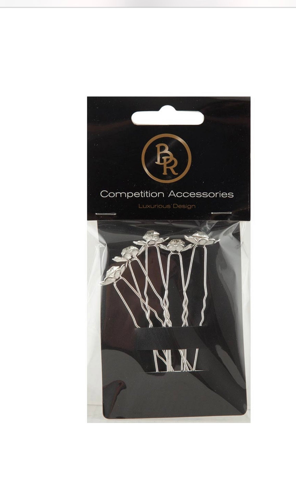 Chic, flower-shaped bun pin with large imitation diamond in the centre and silver petals. Bun pins can be used to secure a neat bun. Insert the pin halfway into the bun. Then twist the pin 90 degrees and slide it further into the bun. Diameter 17 mm. Length of pin 6 cm. Comes in set of 5.