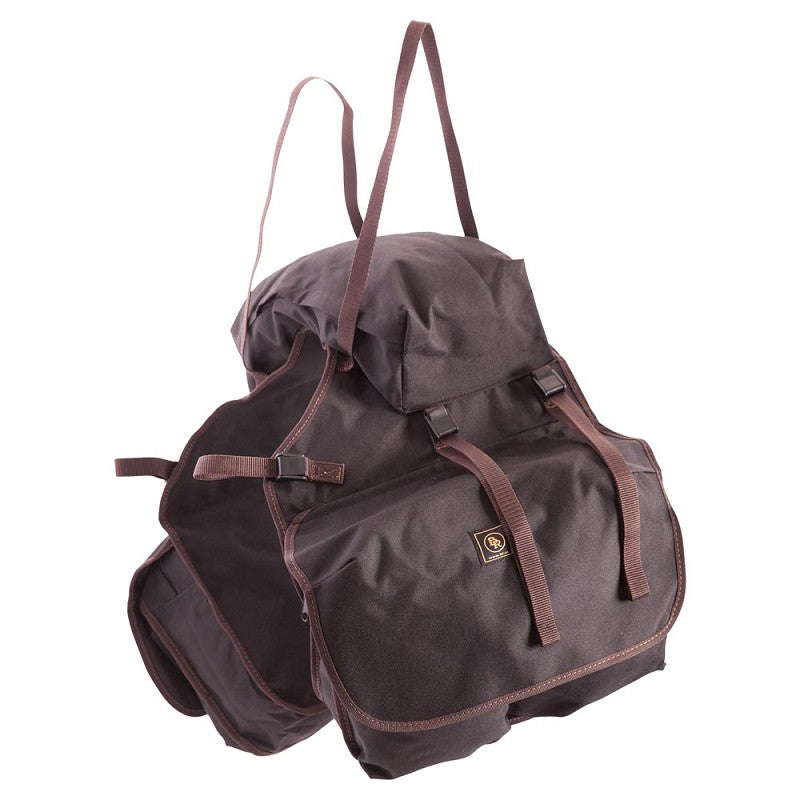Double saddle bag made of 600D polyester with extra pockets on the side and a cantle bag.
