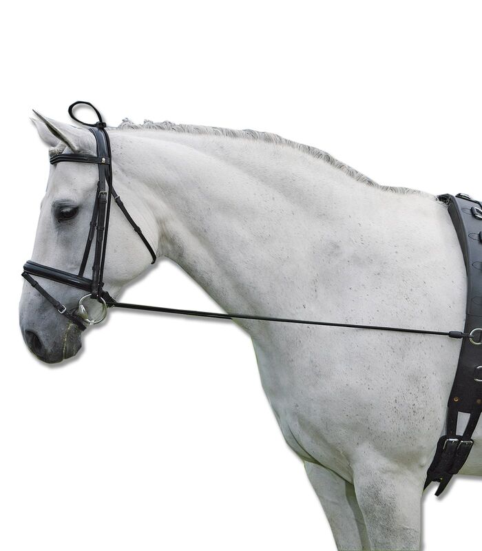A perfect training aid for horses that stiffen their neck and resist the rider's hand. Especially useful for schooling young horses. Also suitable for lunging work. Fully elastic and infinitely adjustable.