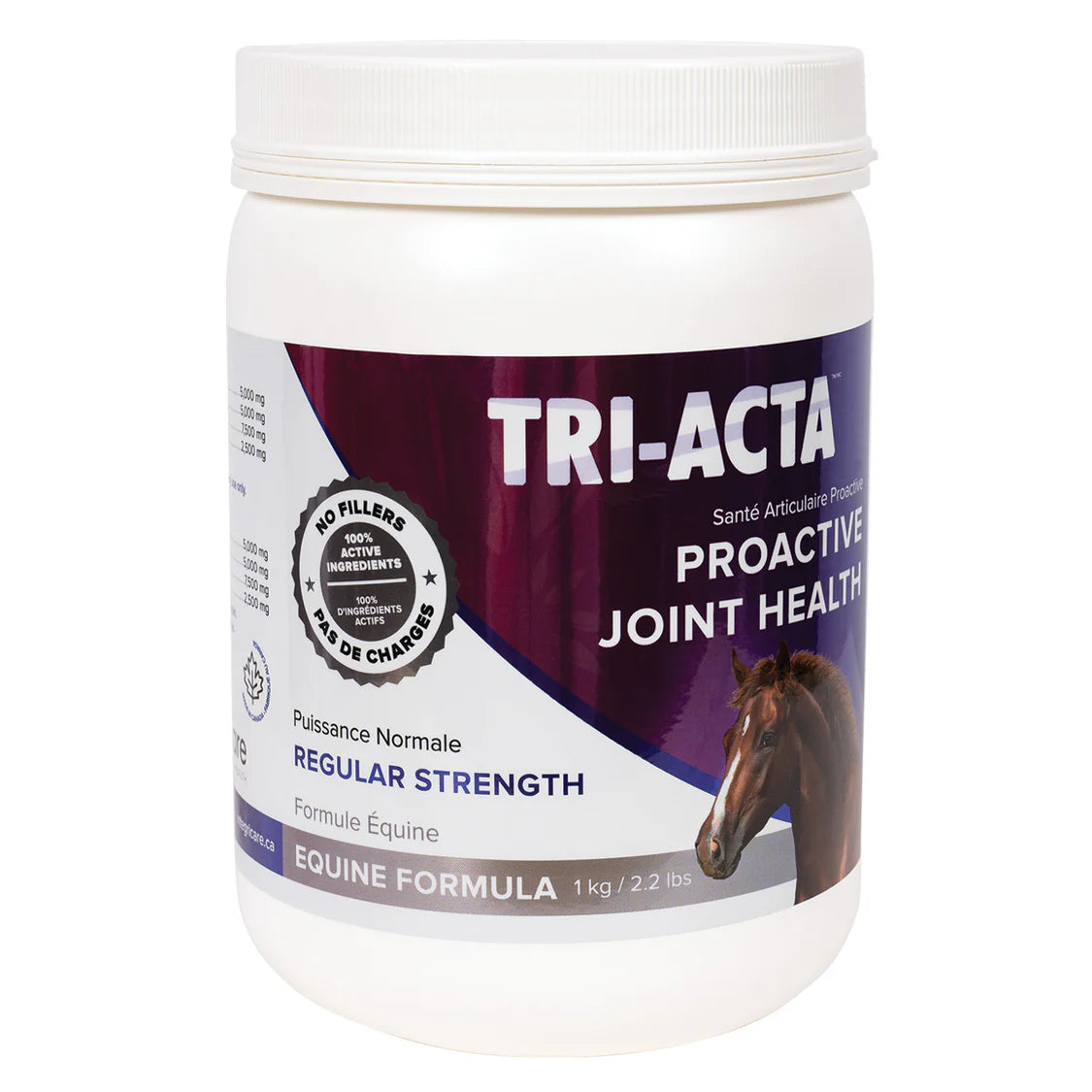 Tri-Acta Equine Regular Strength helps support normal joint lubrication and mobility. This supplement contains 100% active, pharmaceutical-grade ingredients with no fillers or additives. Contains glucosamine, MSM, and more. All ingredients are sourced within Canada. Powder. 1 kg.
