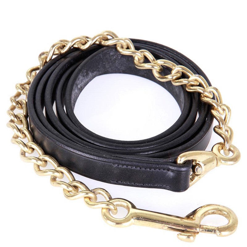 Leather lead chain (19 mm) with 45 cm gold-coloured chain with swivel snap hook. The leather part is 150 cm long.