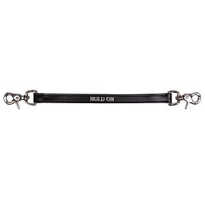 Buckle strap with the text 'hold on' which you can attach to the front of the saddle. You can attach the buckle to the D-rings of the saddle. A buckle can serve as extra support for riding young horses or for the novice rider.