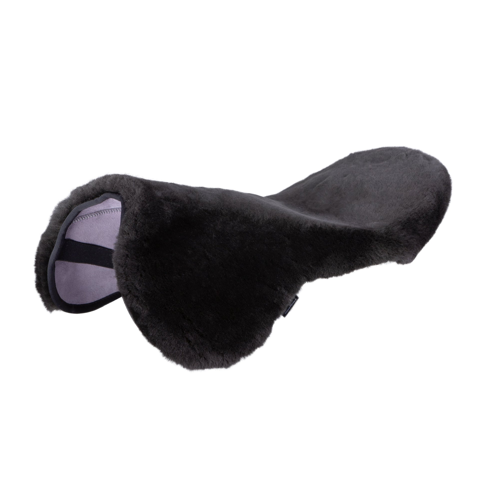 The saddle seat cover is optimally adapted to English saddles. It is attached using a rubber band between the upper and lower saddle flap. In addition, the seat cover is fixed with a Velcro strap through the saddle chamber.