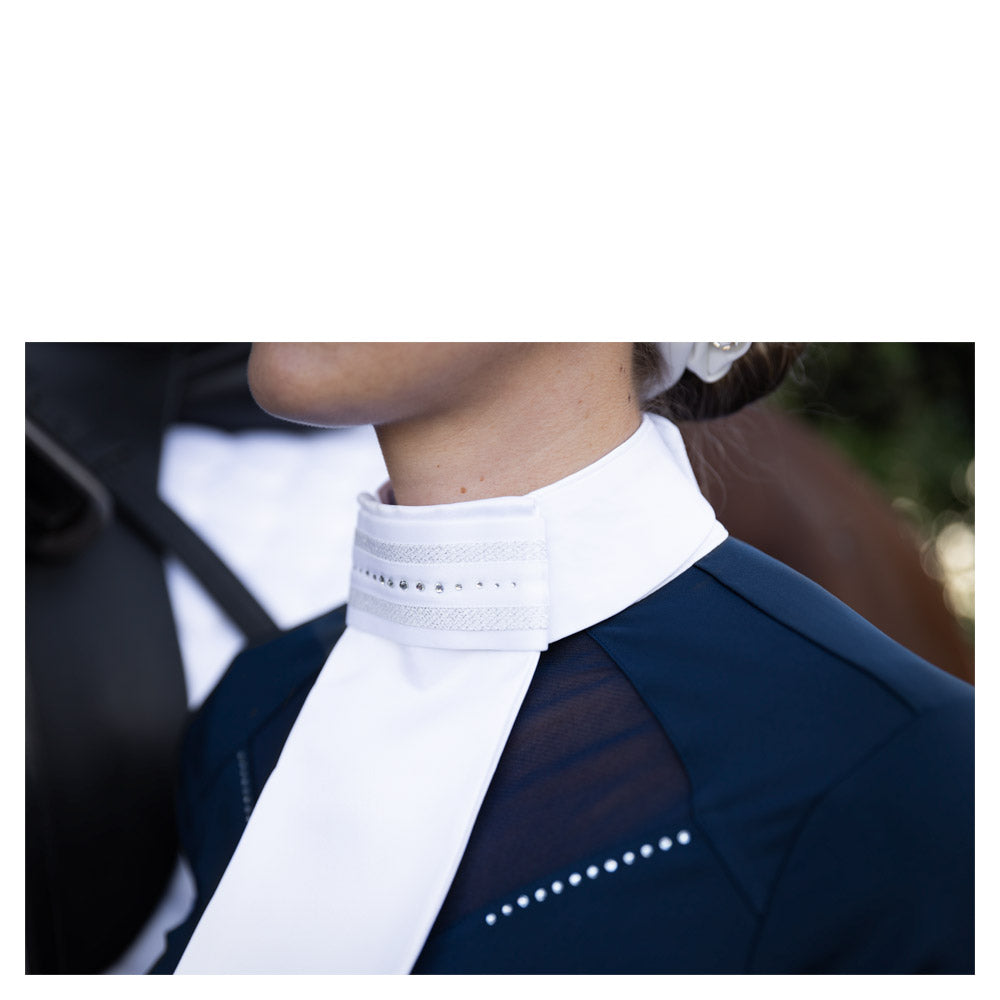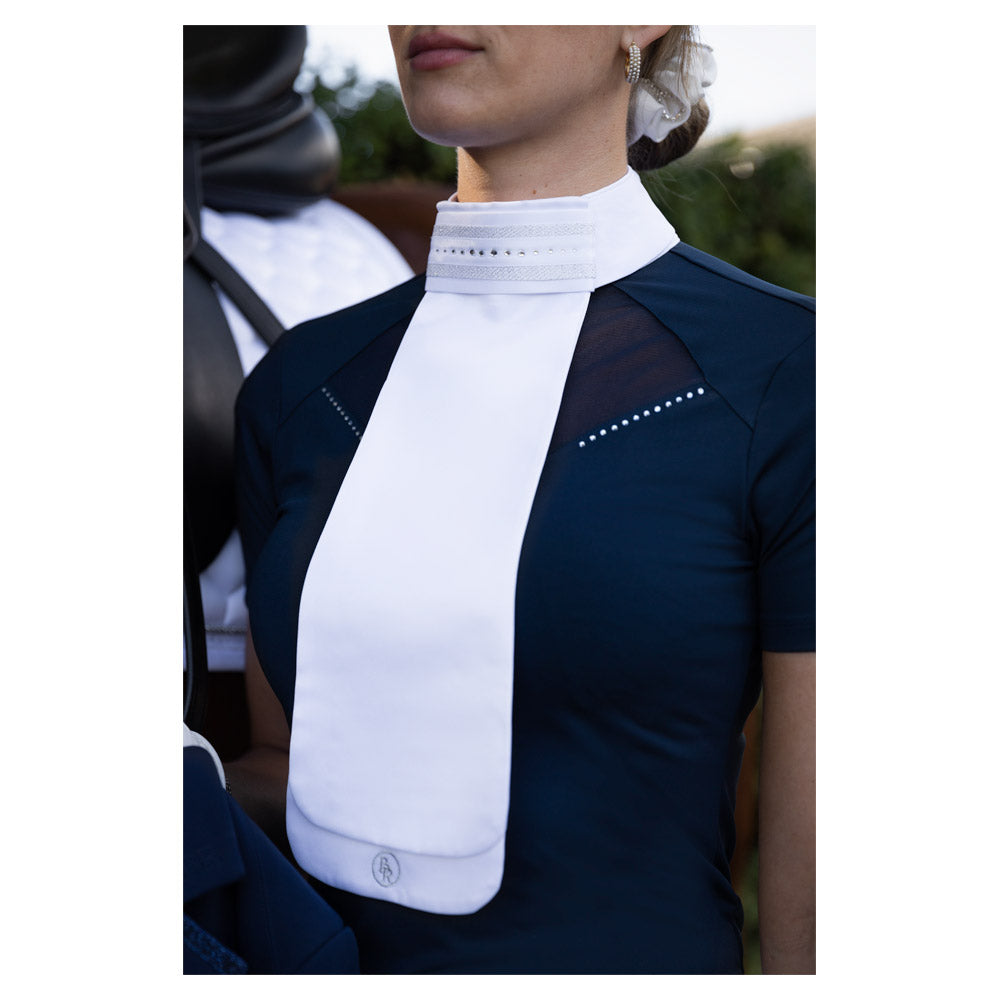 The stock tie is extremely practical to use, does not need to be folded and the use of a stock pin is also unnecessary. The stock tie is easy to attach to the collar of the competition shirt or the competition blouse by means of the Velcro closure at the back. Material: 100% polyester satin.