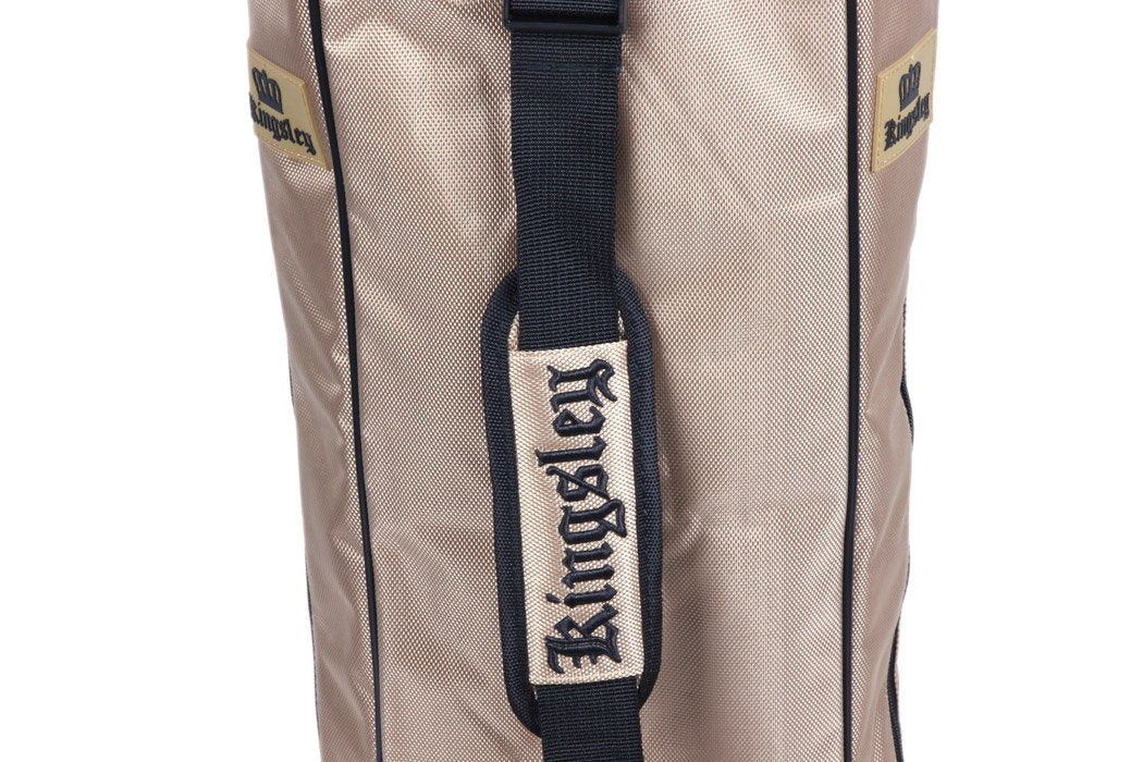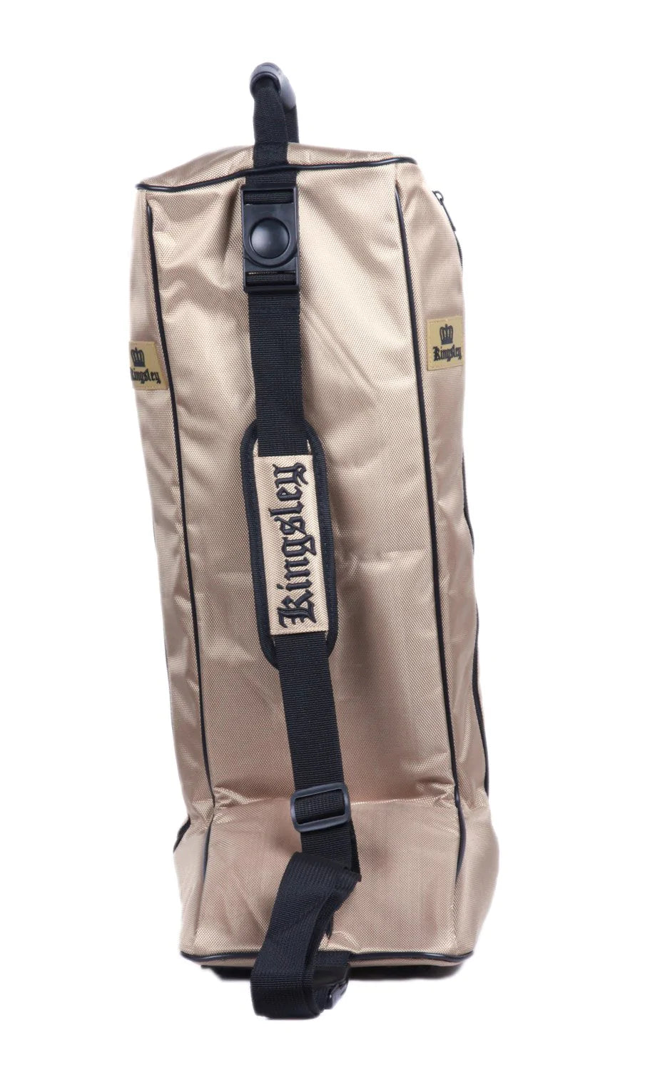 High quality boot bag by Kingsley featuring two separate compartments, one for each boot, padded inside with pockets for spurs. Two carrying straps, one at the top and one over the shoulder! Available in 2 sizes! Colour Gold/Black