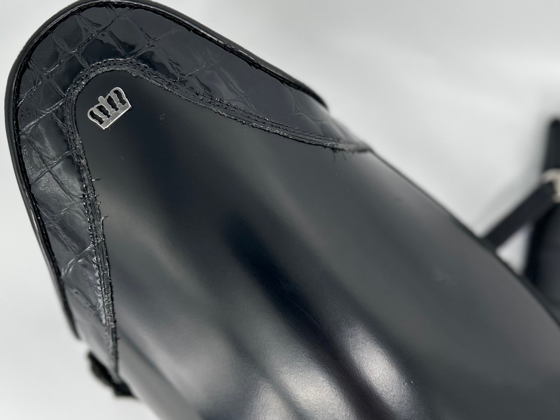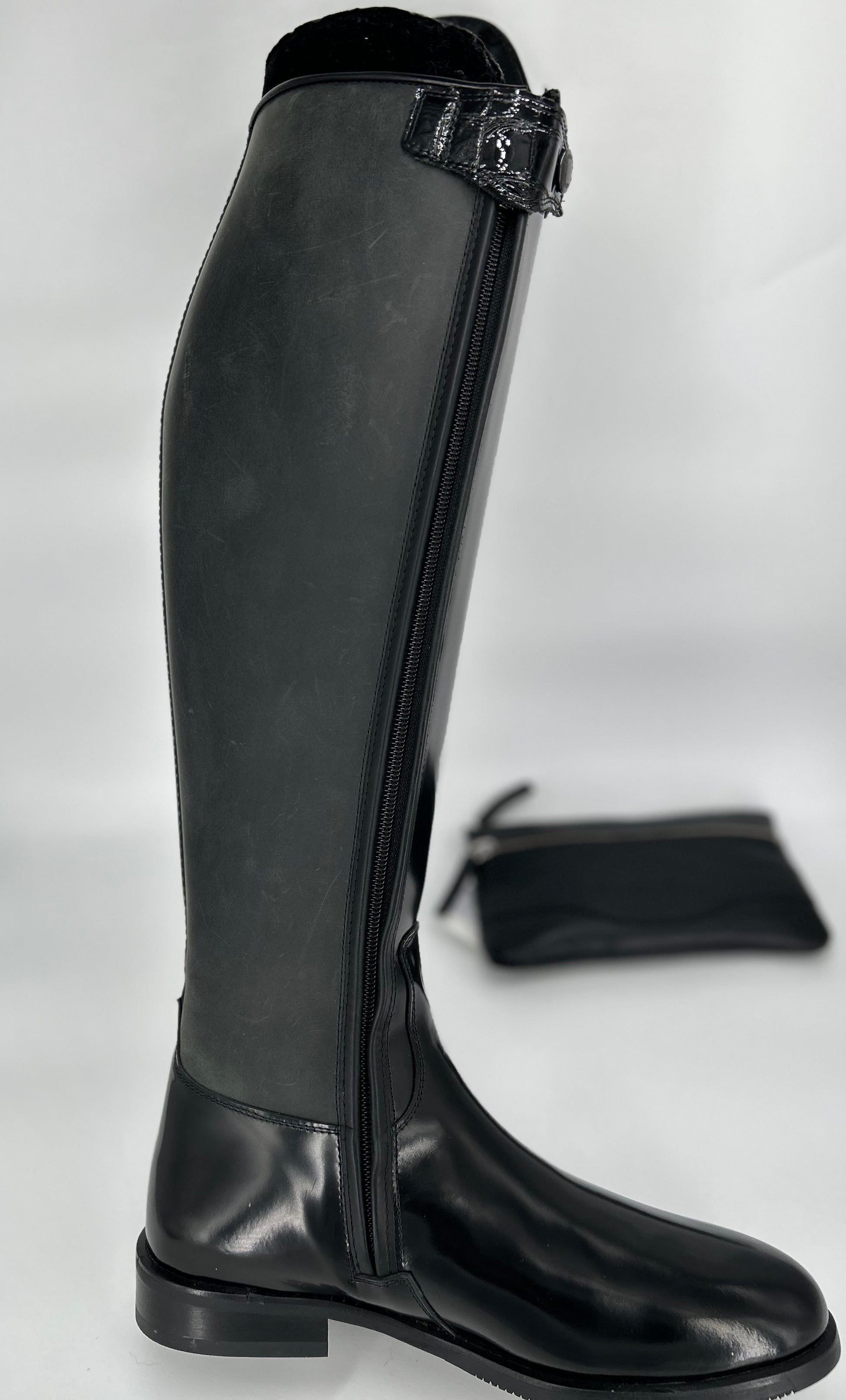 These Classy Kingsley Capri 01 are the perfect boot for both shows and schooling. Made with Kingsley's premium 124 Uragano (Polished) Black Leather throughout with 77 Gaucho Black inside shaft for wear and grip. Featuring leather 66 Croco Bil Black on the Jenny Top and Zipper Protector, 293 Nature Black along the zipper, and Extra Hard Outside Shaft for added support.
