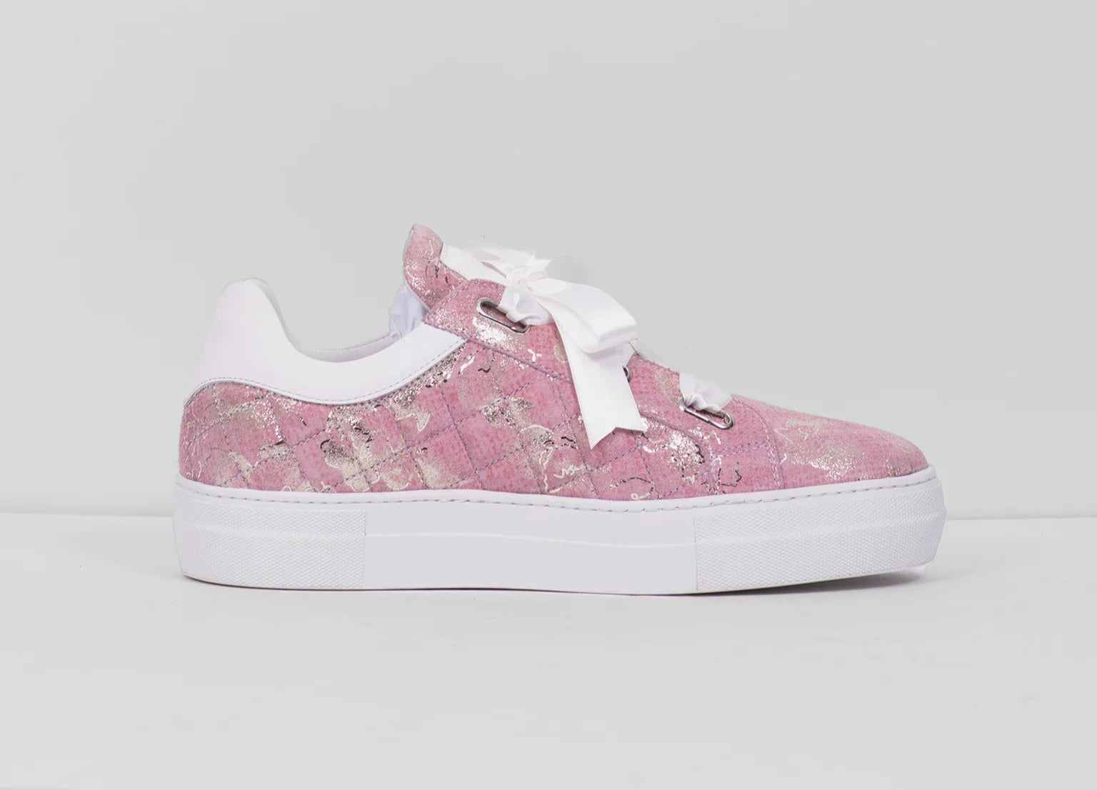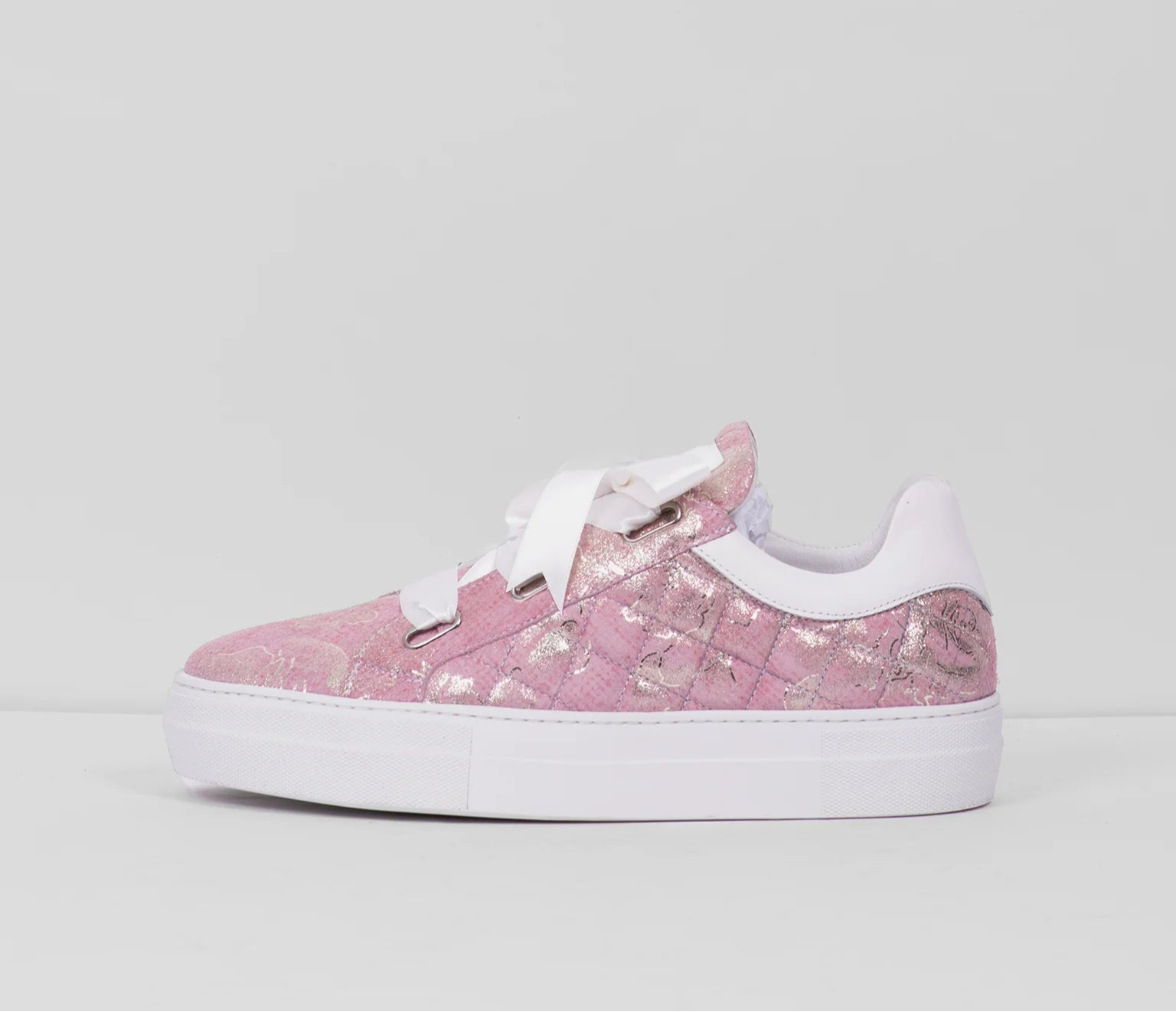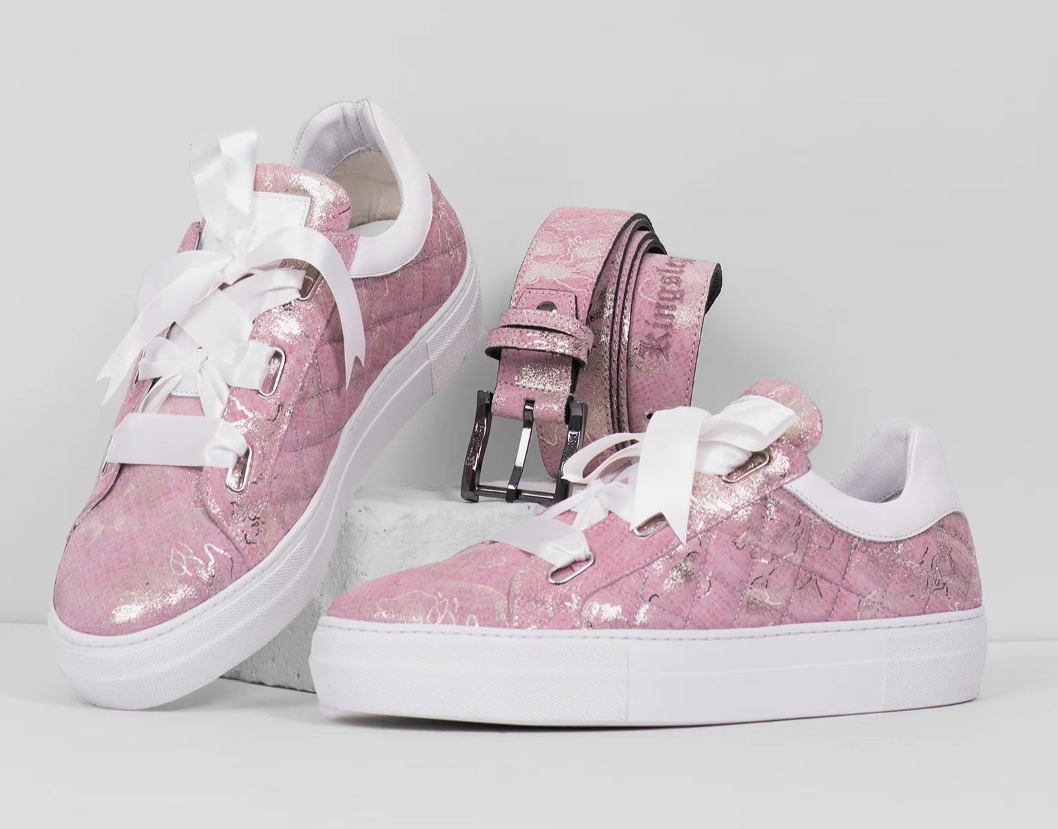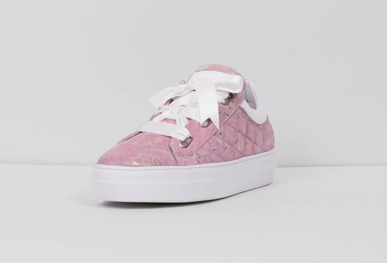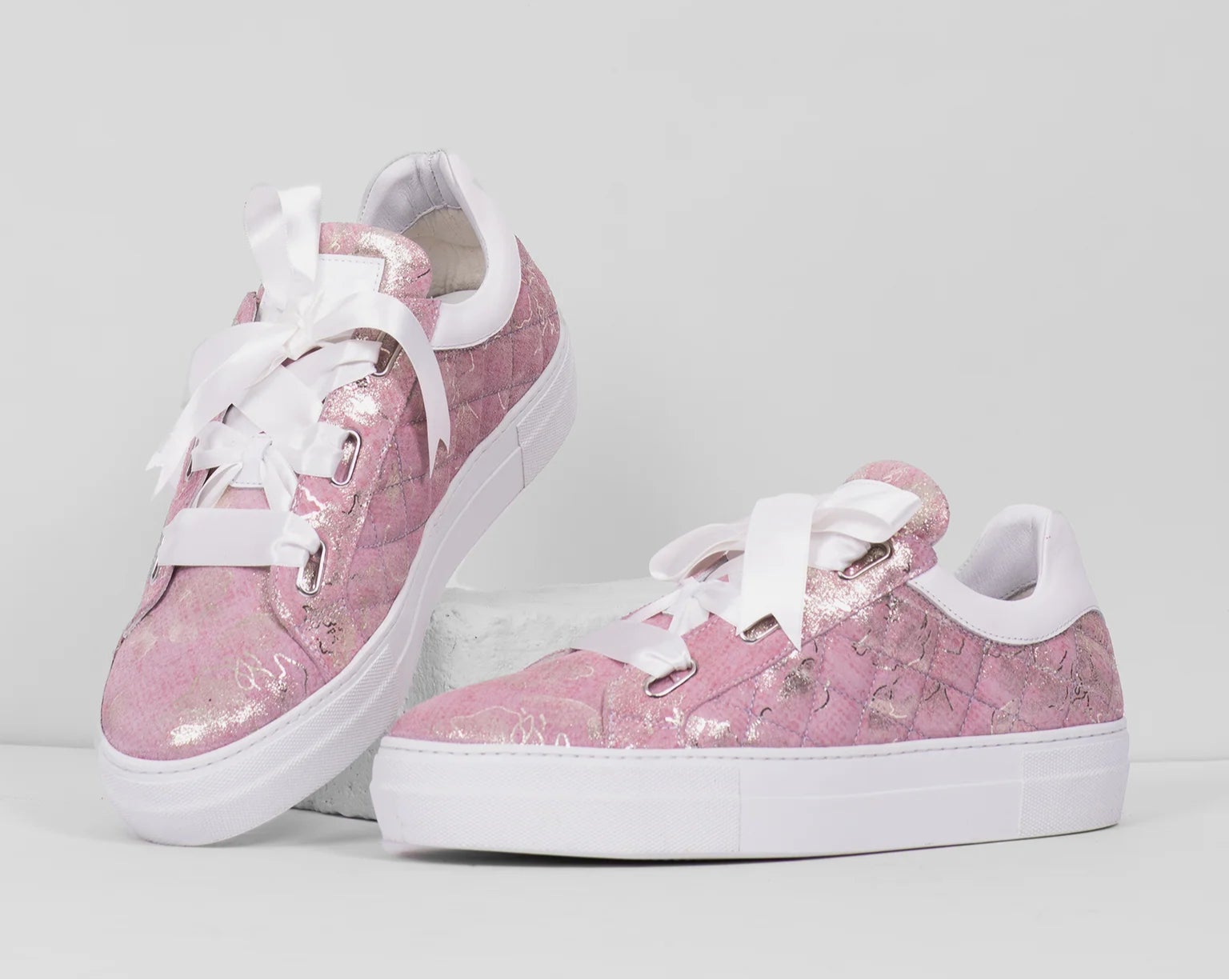 Kingsley Joy Sneakers in custom selected 507 Metallic Flores Pink Leather throughout. Featuring 9001 White Fashion Leather along the collar, 81 Roma White Logo Patch, white stitching, white laces, silver eyelets, and a white outsole.