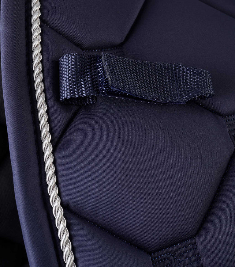 Complete with decorative twisted ropes which accent the outer edge of the saddle square, adding a touch of embellishment. Adjustable Velcro D loop straps and Velcro girth straps allow you to secure your saddle. One of the best close contact dressage squares for those who want to make a statement in the equestrian field.