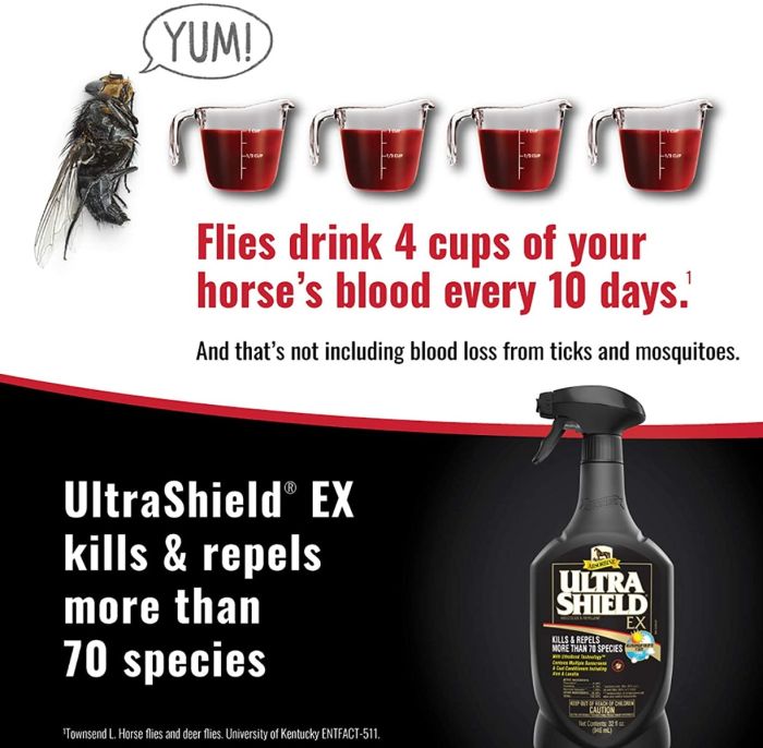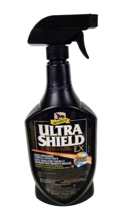 As the most advanced formula Absorbine® offers, UltraShield® EX fly spray delivers proven fly control horse owners like you depend on for the comfort and protection of your horses. When you need to eliminate fly frustrations, reach for The Fly Spray in the Black Bottle™. Weatherproof for up to 17 days, UltraShield® EX kills and repels more than 70 species of biting and nuisance flies, mosquitoes, ticks, and gnats and also contains multiple sunscreens and coat conditioners, including aloe and lanolin. Easy, ready-to-use, water-based formula can also be used as a premise spray in and around the barn, tack room, or trailer – an important part of your overall fly control strategy.